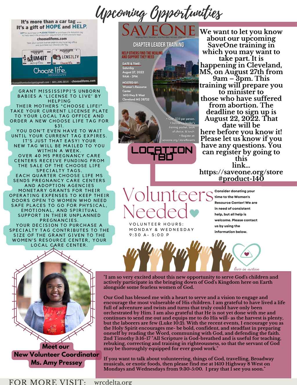My name is Breanna Jurgenson and I am 19 years old. I have been volunteering at the Women’s Resource Center for almost a year. I love the community and atmosphere that the staff and other volunteers create at the center. It is evident that these sweet ladies have hearts that are eager to share the gospel, lovingly, patiently, and with great understanding and compassion. Whether it is sorting donations or counseling an indecisive mother, everyone here is truly striving to make Christ known in the lives of struggling women, I have seen much growth at the Women’s Resource Center in the short time I have been here, and I am excited to see what the Lord has in store as we carry on this great ministry.